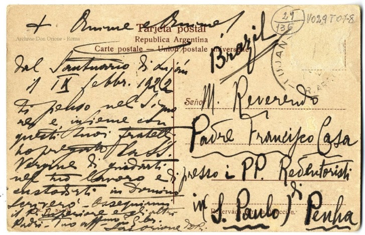 Son conocidas las veces que Don Orione, estando en Argentina peregrinó a la Basílica de Luján. Precisamente, en una carta a Mons. Silvani fechada el 5 de noviembre de 1921 Don Orione le dice: