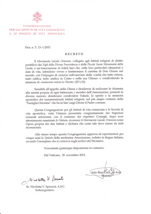 Ricordiamo anche un nuovo anniversario del riconoscimento canonico del Movimento Laicale Orionino e la approvazione dello Statuto.